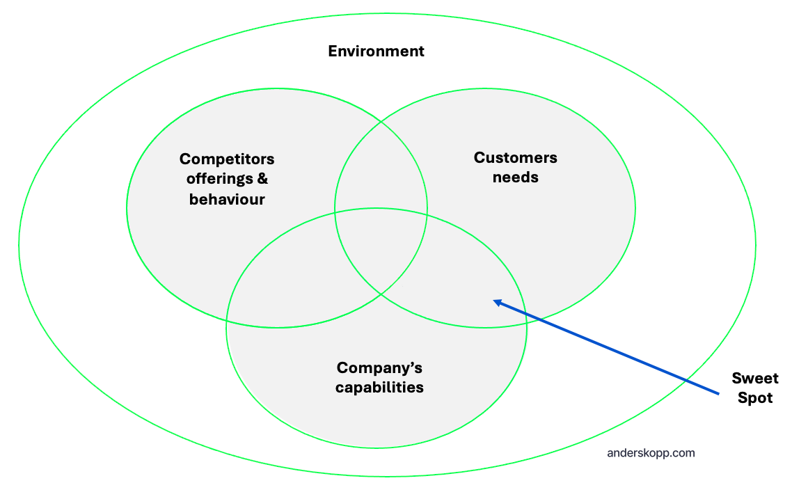 Inspired by Collis and Ruksta you can illustrate this like in the model above. Positioning is not about spinning something to fit your narrative, but finding out how to act - and in which order - based on a balance between the company’s capabilities, what the customers need, while you also look at what the competition does. All this of course happens in specific context or environment that shapes these three factors.